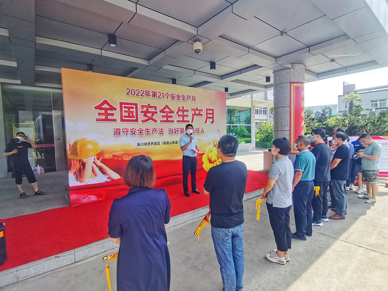 2022年6月23日上午9:00,由崇川经济开发区新胜社区组织,华业园区协助的“安全生产月”活动在华业园区西区顺利召开。本次活动聚焦“遵守安全生产法 当好第一责任人”主题,在全区范围内掀起安全生产大学习、大比拼、大讨论、大宣传浓厚氛围,努力营造园区安全生产宣传浓厚氛围。